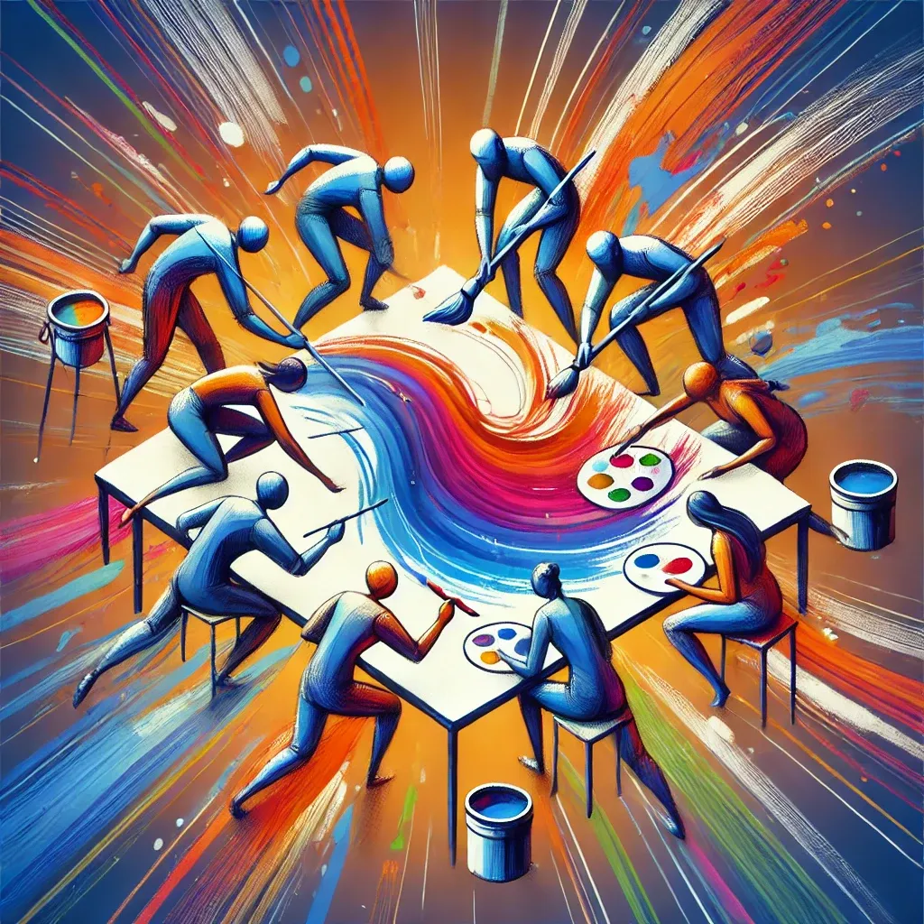 Dans une approche de groupe, la psychomotricité et l’art-thérapie peuvent être combinées pour favoriser le travail collectif et renforcer la communication non verbale entre les participants. Dans ce type de séance, les participants sont invités à créer ensemble une œuvre d’art à travers le mouvement. Par exemple, ils peuvent peindre une fresque commune en se déplaçant autour de la toile, en utilisant des pinceaux longs ou en créant des empreintes avec leur corps. Le processus collectif permet de renforcer les liens entre les participants, d’encourager l’expression individuelle dans un cadre collaboratif et de travailler sur des problématiques de communication et de coopération.